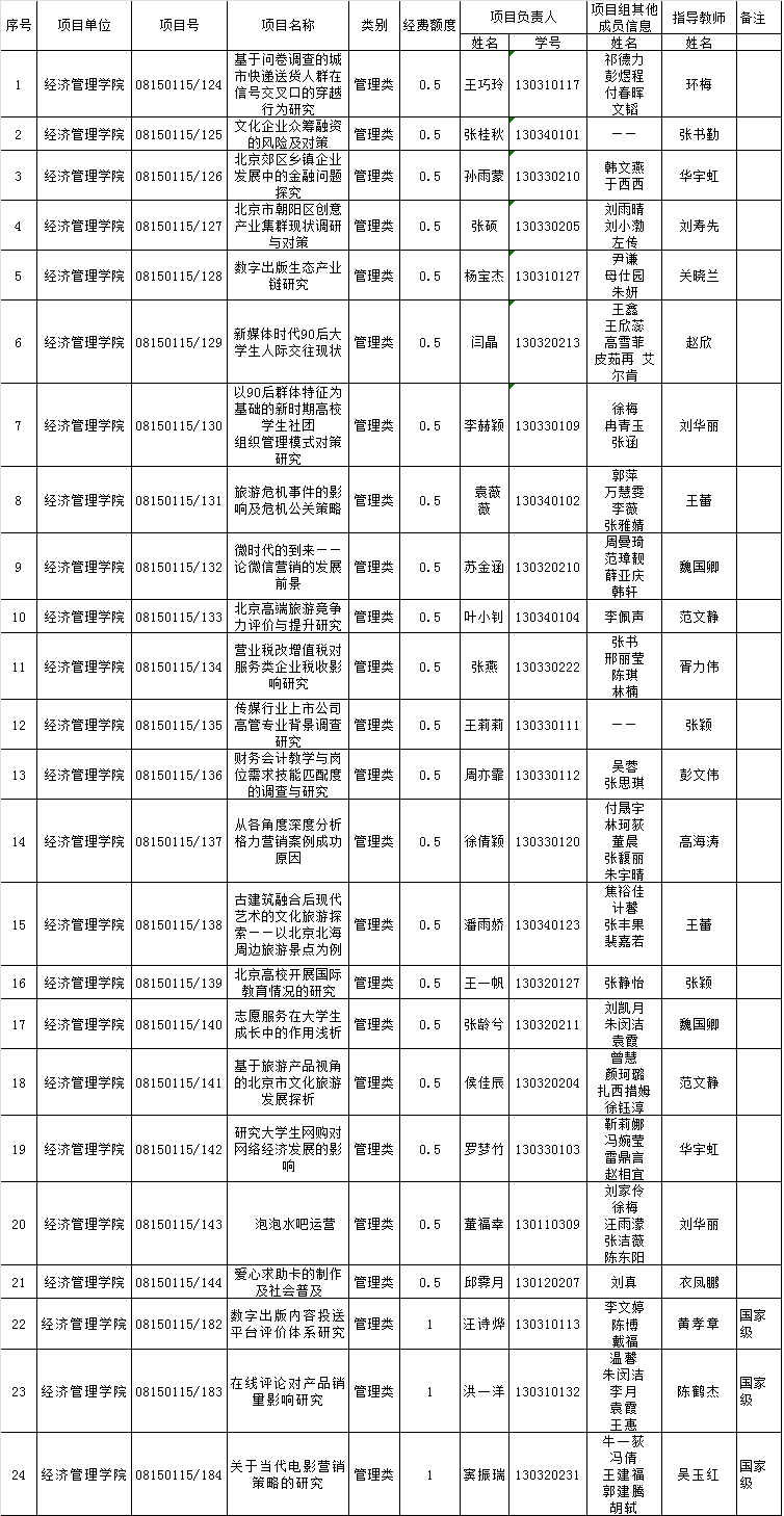 经济管理学院--2015年国家级创新创业训练计划项目、北京市本科生科学研究计划项目汇总表