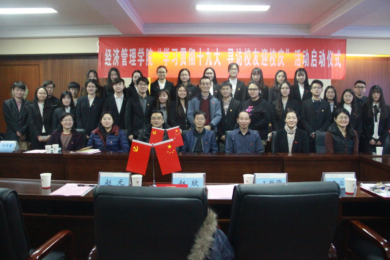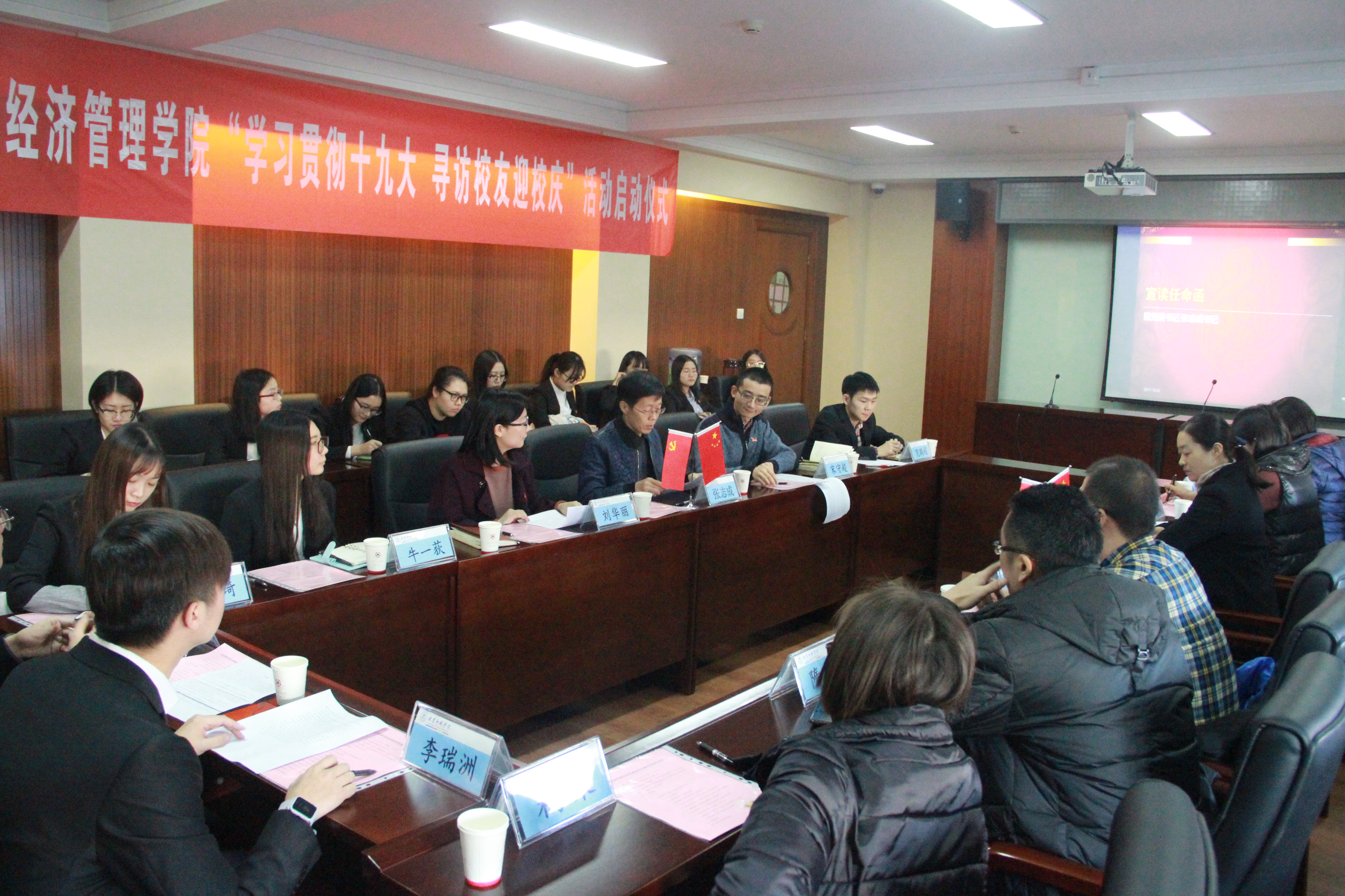 12月20日下午4点,经济管理学院学生党支部理论学习导师聘任暨“学习贯彻十九大 寻访校友迎校庆”活动启动仪式在西校区办公楼408会议室举行。学校党校常务副校长赵欣,党委学工部副部长王新营,研究生院副院长兼学工部副部长赵元,经济管理学院党委书记张志成、副书记刘华丽,专业老师、学工组老师以及学生党员代表参加活动。活动由刘华丽主持。